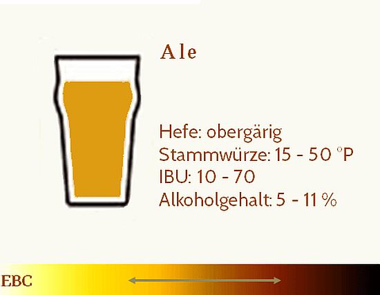 Ale ist ein obergärig gebrautes Bier mit einem leicht süßlichen, vollmundigen und fruchtigen Geschmack.