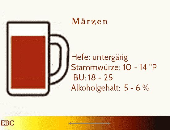 Märzen (Oktoberfestbier) ist ein untergäriges, blassgelbes bis bernstein-farbiges Bier mit einem malzigen Geschmack und einem Alkoholgehalt von meist 5 - 6 % Vol; es wurde ursprünglich im März gebraut.