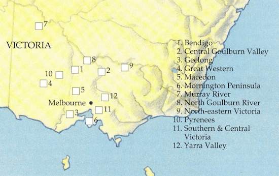 Kommt man von Süden ins Zentrum des Staats und fährt dann von Ost nach West, kommt man erst ins Goulbourn Valley (Mitchelton und Chateau Tahbilk), dann nach Bendigo ( mit 17 Kellereien), zu den Pyrenees (sieben Kellereien, angeführt von Tältarni und Chateau Remy), und schließlich nach Great Western, wo Seppelt seine Hauptniederlassung in Victoria und den wichtigstens Schaumwein-Produktionsbetrieb des Landes hat.