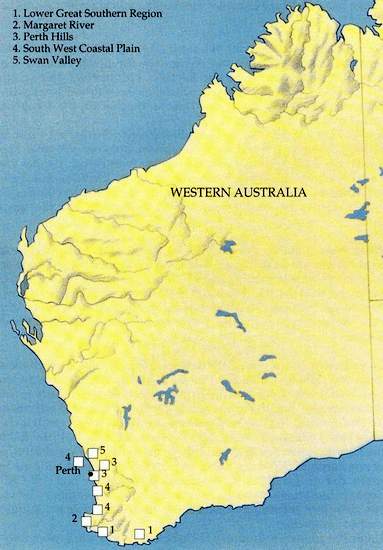 Wenn man die relaiiv geringe Weinproduktion des 19. Jahrhunderts nicht berücksichtigt, war der Weinbau in Western Australia bis 1966 auf das Swan Valley beschränkt. Seit dieser Zeit haben sich die Lower Creat Southern Region, die South West Coastal Plain und Margaret River geöffnet und erzielen nun 67 Prozent der Weinproduktion des Staates. Hier gibt es alle erdenklichen Klimazonen: Im Swan Valley die höchsten Januartemperaturen von allen wichtigen Weinbaugebieten, die geringsten Sommerregen und die meisten Stunden Sonnenschein pro Tag. Im Gegensatz dazu steht das stark vom Meer beeinflußte Klima der Weingärten im äußersten Südwesten Australiens um Denmark und Albany.