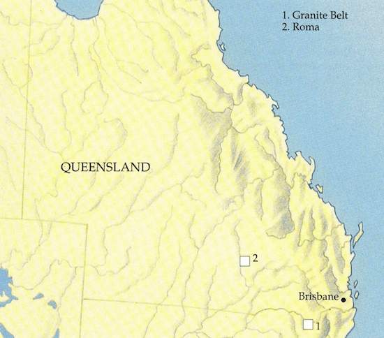 Vernachlässigt man die kuriosen Vorposten des Weinbaus in Roma und in den Atherton Tablelands, konzentrieren sich die Weingärten im Granite Belt-Distrikt von Darling Downs entlang des New England Highway südlich von Stanthorpe bis zur Grenze von New South Wales. Die rund 14 Kellereien sind alle klein, nur Ballandean Estate (mit einer Produktion von 5000 Kästen) verkauft auf dem ganzen Kontinent. Der Distrikt hat die besten Erfolge mit pfeffrig-würzigem Shiraz und Semillon, obwohl das Diktat der vorherrschenden Mode alle Aufmerksamkeit auf Chardonnay, Cabernet Sauvignon und Sauvignon B1anc lenkt. Die Höhenlage ermöglicht den Anbau von Trauben; die Saison beginnt sehr spät und endet spät, was manche behaupten läßt, daß dies eine kühle Klimazone sei - was die hohen Tagestemperaturen jedoch schlagend widerlegen, denn in der Wachstumszeit ist es hier heißer als in Rutherglen im nordöstlichen Victoria.