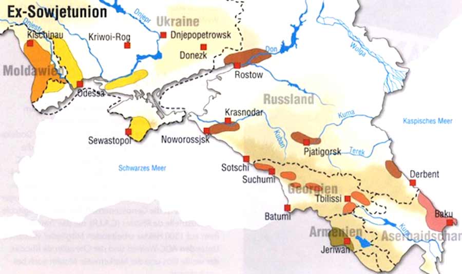 In Georgien stehen an der Schwarzmeerküste und im lnland etwa 100.000 Hektar unter Reben. Unter anderem finden sich hier die bekannten Rebsorten Cabernet Sauvignon, Pinot Noir und Chardonnay. 170.000 Hektar Reben gibt es in Aserbaidschan rund um die Hauptstadt Baku am Kaspischen Meer und weitere 30.000 Hektar in Armenien, und zwar rund um Jeriwan am Schwarzen Meer.