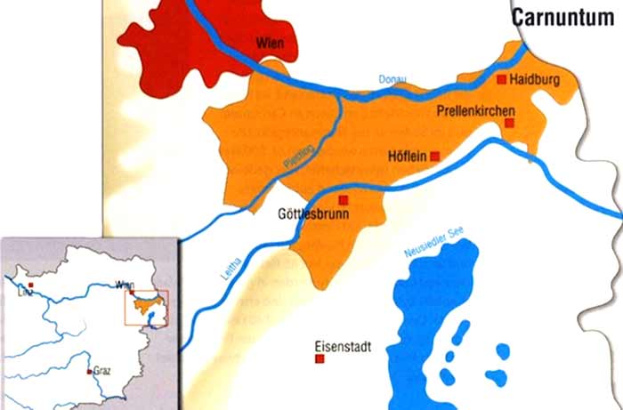 Das kleine Anbaugebiet im Osten von Wien ist 1993 aus dem ehemaligen Wagram-Carnuntum hervorgegangen. Es verdankt seinen ungewöhnlichen Namen einem ehemaligen römischen Hauptstützpunkt an der pannonischen Donaugrenze bei Bad Deutsch-Altenburg. Die Weinberge des Carnuntum erstrecken sich auf dem südlichen Ufer der Donau dem Weinviertel gegenüber von Wien bis zur slowakischen Grenze. 900 Hektar sind hier mit Reben bestockt, davon 320 Hektar Grüner Veltliner. 120 Hektar Blauer Zweigelt, je 70 Hektar Welschriesling und Blaufränkisch sowie über 30 Hektar Blauburgunder. Auf über 50 Hektar werden Reben im gemischten Satz kultiviert.