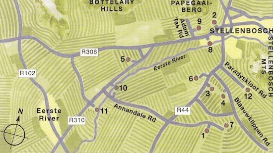 dazugeführt, dass das Gebiet in Unter-Appellationen aufgeteilt wurde wie zum Beispiel Simonsberg-Stellenbosch, Jonkershoek, Bottelary und Devon Valley. Abgegrenzt sind ferner Helderberg, Koelenhof und Vlottenburg. In ähnllcher Welse können auch die Weinkellereien und Weingüter am Rande von Stellenbosch entlang des Eerste River und in Paradyskloof zwischen dem Stellenbosch-Berg und der Helderberg-Bergkette zur Unter-Appellation Stellenbosch-Umgebung zusammengefasst werden, da sie entweder nicht in ein anderes Gebiet hineinpassen oder im weitesten Sinne eine Stellenbosch-Identität bewahren möchten.