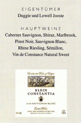 Erfolg, dem Vin de Constance. Von diesem in alten Holzfässern ausgebauten edelsüßen Wein, der aus Muscat-de-Frontignan-Trauben und in der Tradition der alten, süßen Constantia-Weine aus dem 17. Jahrhundert hergestellt wird, waren die melsten kritischen Gaumen hingerissen. Er wurde auf internationalen Weinwettbewerben Seite an Seite mit dem Chateau d'Yquem präsentiert.