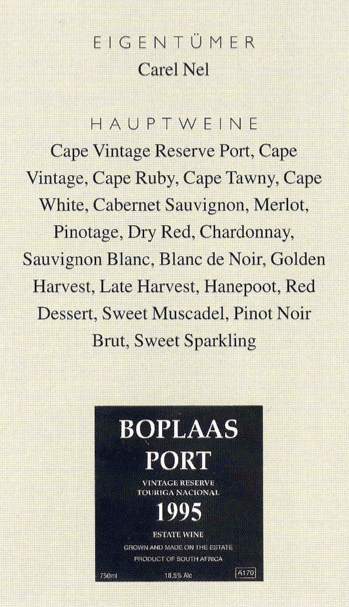 (sowohl der Jahrgang 1996 als auch der von 1997 haben einen solchen Wein hervorgebracht), ist ein dunkler, kräftiger Wein mit Aromen von Pflaumen und einer massiven Struktur, wodurch er für die Alterung besonders geeignet ist. Sein vielfach preisgekrönter sortenreiner Touriga Nacional aus dem 1995er Jahrgang ist aus demselben Holz geschnitzt. Der Cape Vintage ist jünger trinkbar und besitzt mehr Eleganz als Stärke. Tatsächlich zeichnen sich alle Boplaas-Portweine durch Ausgewogenheit und Harmonie aus, obwohl der Ruby, der Tawny (ein netter Wein im Sortiment) und der Late Bottled Vintage einen guten alkoholischen Biss besitzen.