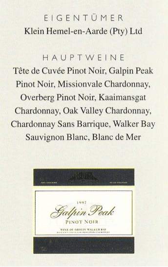 Seine ersten Weine aus eigenen Trauben waren der Galpin Peak Pinot Noir und der 1997er Missionvale Chardonnay. Ersterer ist ein großartiger Wein, karmesinrot, reich an Aromen von Himbeeren und Gewürzen, unterlegt von festen Tanninen und Noten von Kaffee, der zweite ist ein eleganter Wein, der sich durch Aromen von Melonen und tropischen Früchten auszeichnet.