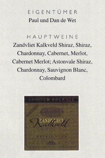 der u. a. auch De Wetshof und Thelema berät. Shiraz, Cabernet und Merlot werden auf diesen Bergen alle gut gedeihen, doch vor allem der Shiraz zeigt bereits eine Änderung im Stil. Bei den ersten Weinen, die aus diesen "Kalkland"-Reben vinifiziert wurden, stammten die Trauben aus dem 1996er Jahrgang und wurden am Ende des Millenniums als Zandvliet Kalkveld Shiraz zum Verkauf freigegeben. Diese Weine und die nachfolgenden Jahrgänge sind von intensiver Farbe und hoher Fruchtkonzentration auf der Basis von ganz neuem Eichenholz. Sie bedeuten einen wirklich neuen Kurs für Zandvliet. Die de Wets experimentieren mit französischem und amerikanischem Eichenholz, variieren die Zeiten, in denen der Wein auf der Schale gärt, und die Verwendung von ablaufendem und gepresstem Traubensaft. Trauben aus verschiedenen Lagen werden separat vinifiziert, damit Qualität und Entwicklung jedes einzelnen Weines verfolgt werden können.