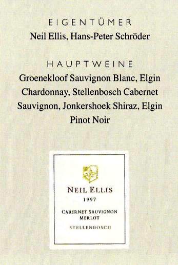 Die Qualität des Shiraz und insbesondere des Cabernets führte im letzten Jahr zur ersten Flaschenabfüllung aus der hervorragenden 1997er Ernte. Unter dem Etikett Neil Ellis Jonkershoek Valley wines werden diese Spitzenweine in französischen Eichenfässern ausgebaut und weisen ein schönes Aroma von reifen roten Beeren auf, das sich sofort am Gaumen entfaltet und doch eine Intensität und Komplexität offenbart, die durch Lagerung noch gewinnen werden.