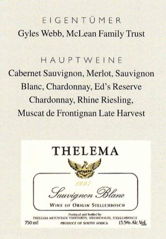 Der Cabernet Sauvignon und der Merlot, die früher im Stil der neuen Welle zu einem vorbildlichen Wein verschnitten wurden, glänzen nun sortenrein und wetteifern miteinander um Saftigkeit, Geschmacksintensität und die unverkennbare Minzenote des Weinguts Thelema. Webbs Standard-Chardonnays sind köstliche Mischungen aus fruchtigem Zitrus- und Marmeladenaroma und einer kräftigen Note von geröstetem Eichenholz. Sein rassiger Sauvignon Blanc mit seinem kräftigen Stachelbeeraroma ist einer der beliebtesten Kap-Weine, er ist praktisch bereits schon vor seiner Freigabe ausverkauft. Und es wird noch mehr geben: Neupflanzungen in nahegelegenen gepachteten Weinbergen, sein erster Shiraz, vielleicht ein wenig Petit Verdot, mehr Cabernet und Sauvignon Blanc bis zu speziellen Export-Abfüllungen aus zugekauftem Traubengut unter dem Etikett Stormy Cape.
